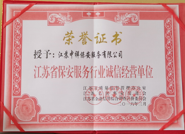 江蘇中祥保安公司榮獲江蘇省保安服務行業誠信經營單位